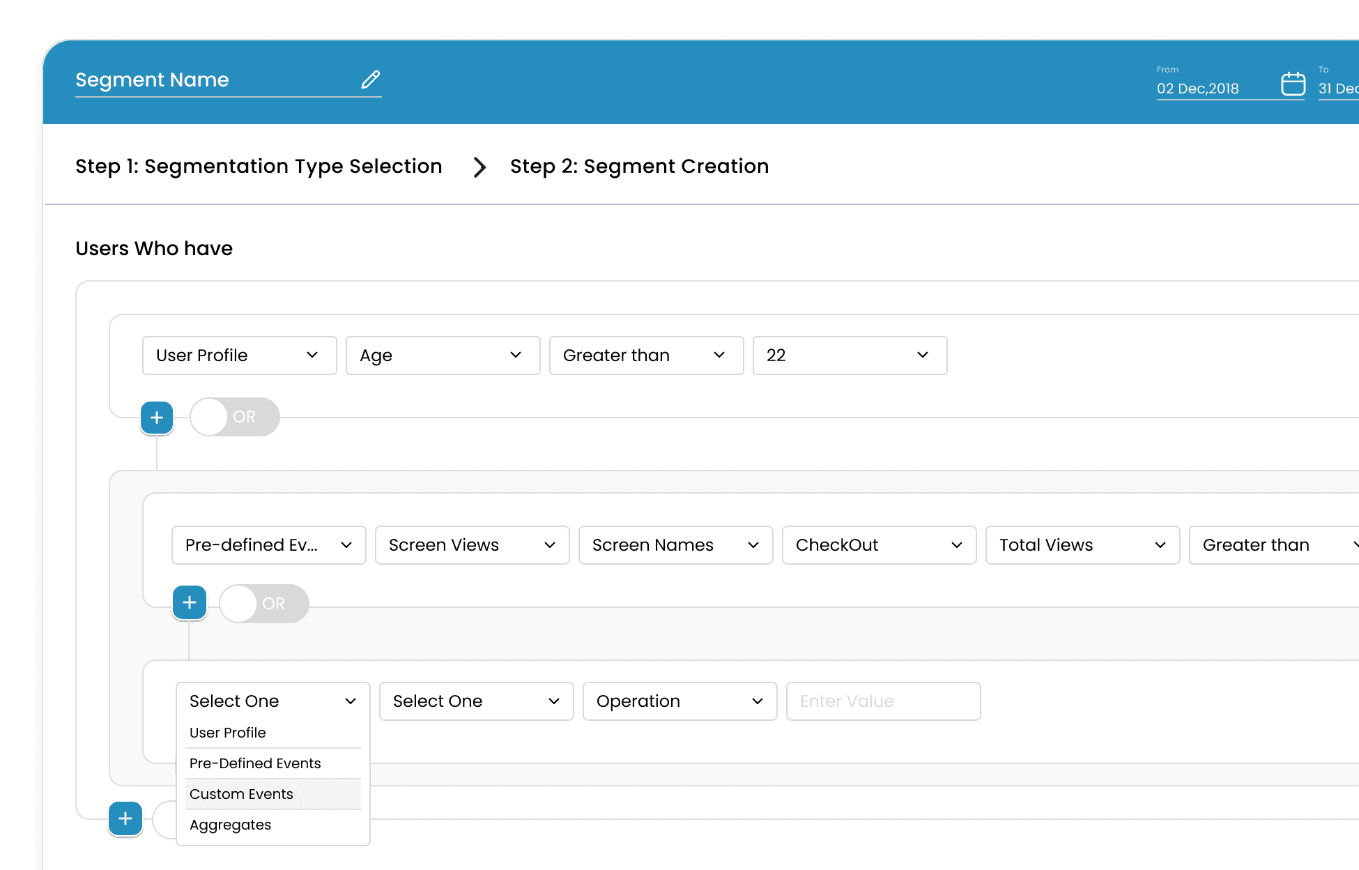 Create segments based on user profile attributes and app usage behavior, including custom attributes unique to your app/website. These segments can be defined with a timeframe, either static or dynamic, depending on the "from" and "to" dates.